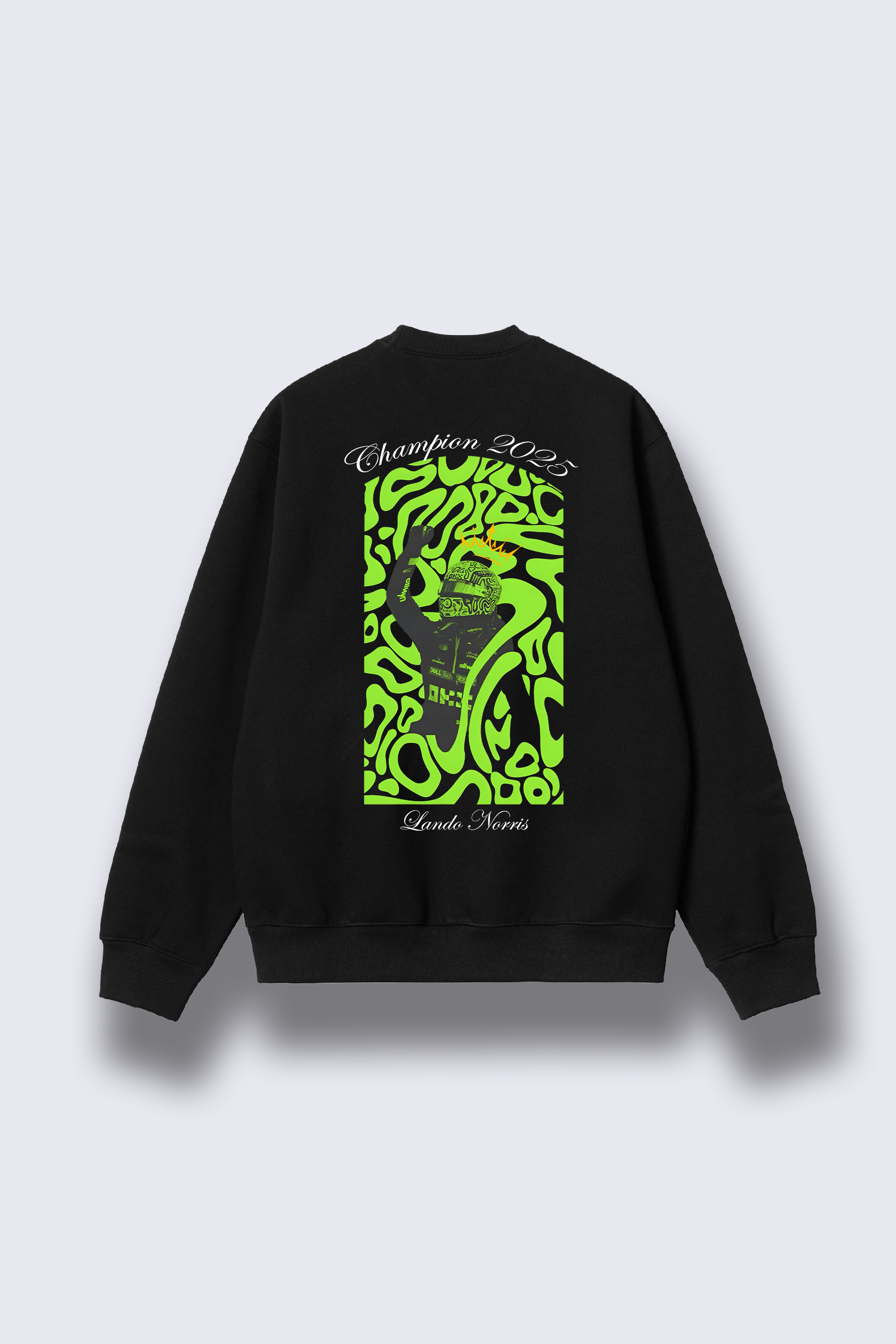 Celebrate a championship moment in style. This premium black crewneck features a clean, centered graphic of a crowned helmet with bold green detailing, capturing the spirit of victory. Soft, warm, and minimalistic — it’s the perfect blend of comfort and fan pride for any Norris supporter.Premium 300 GSM heavyweight fleece — warm, soft and winter-ready.