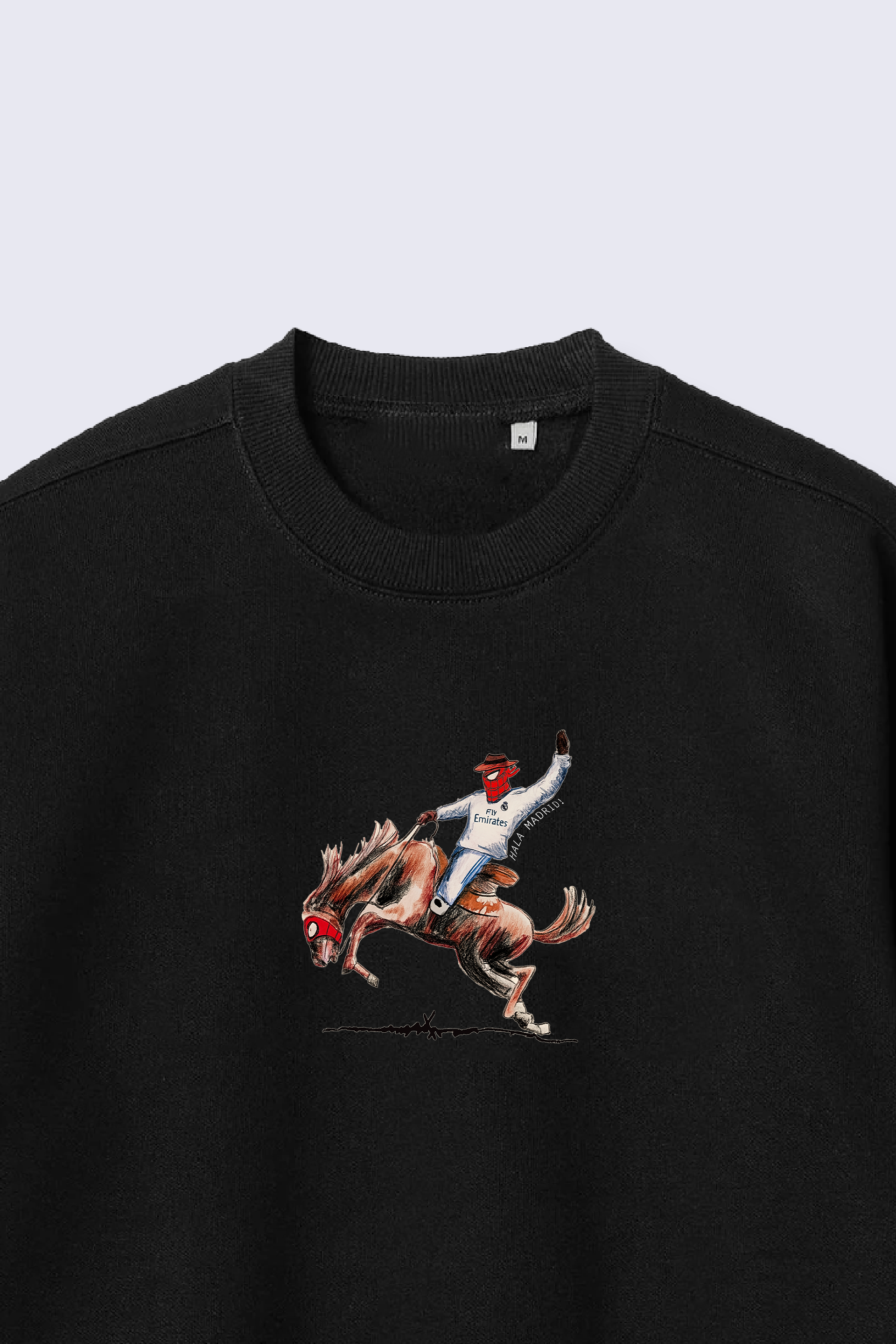 A bold crossover of Western grit and football royalty. This black crewneck features a striking embroidered cowboy riding hard—finished with Madrid-inspired colors that quietly nod to legacy, dominance, and attitude. Minimal from afar, powerful up close.